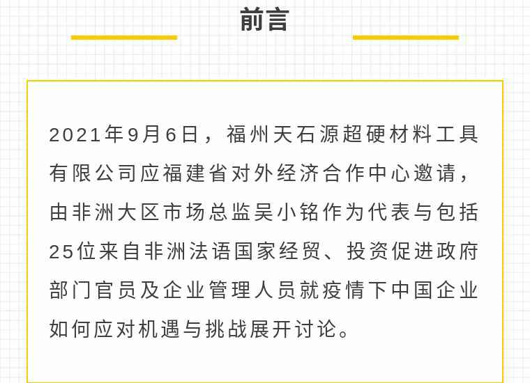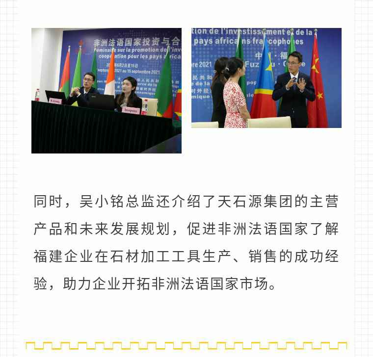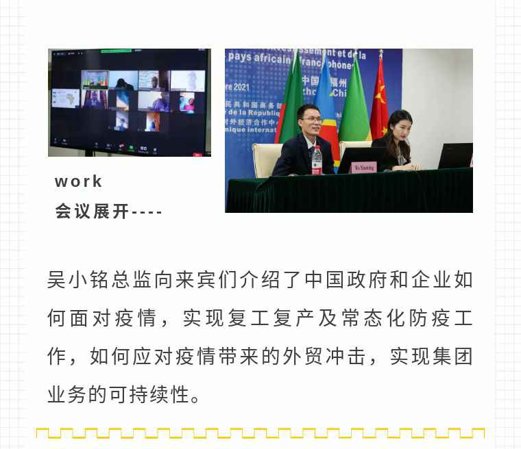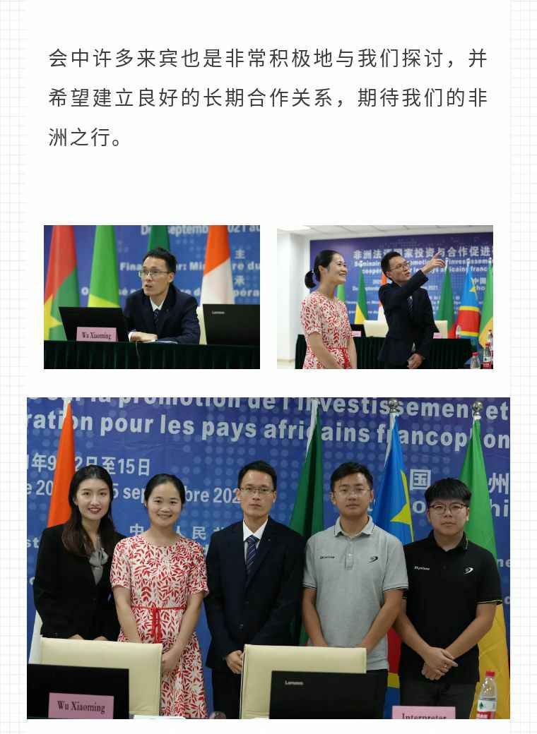 2021年9月6日,开云网页版·网站在线登入-开云(中国)应福建省对外经济合作中心邀请,由非洲大区市场总监吴小铭作为代表与包括25位来自非洲法语国家经贸、投资促进政府部门官员及企业管理人员就疫情下中国企业如何应对机遇与挑战展开讨论。